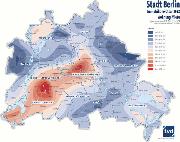 In der Rangliste der Bezirke gab es im Vergleich zum Vorjahr keine Veränderungen: Spitzenreiter auf dem Berliner Mietwohnungsmarkt bleibt Charlottenburg-Wilmersdorf mit einer Schwerpunktmiete in Standardwohnlagen von 8,75 €/qm und in Vorzugslagen von 10,50 €/qm nettokalt (2012: 8,25 €/qm bzw. 10,00 €/qm). Auf Rang zwei folgt wie im Vorjahr der Bezirk Mitte mit 7,50 €/qm in Standardwohnlagen bzw. 10,00 €/qm in Vorzugswohnlagen (2012: 7,25 €/qm bzw. 9,75 €/qm). Steglitz-Zehlendorf belegt erneut den dritten Rang mit Schwerpunktmieten von 7,75 €/qm in Standardwohnlagen und 9,75 €/qm in Vorzugswohnlagen (2012: 7,25 €/qm bzw. 9,75 €/qm). Auf Platz vier und fünf liegen wie im Vorjahr Pankow und Tempelhof-Schöneberg mit jeweils 7,25 €/qm in Standardwohnlagen und 9,00 €/qm in Vorzugswohnlagen (Pankow 2012: 7,25 €/qm bzw. 8,75 €/qm, Tempelhof-Schöneberg 2012: 6,75 €/qm bzw. 8,50 €/qm).